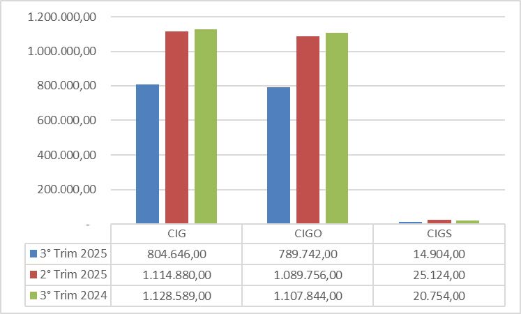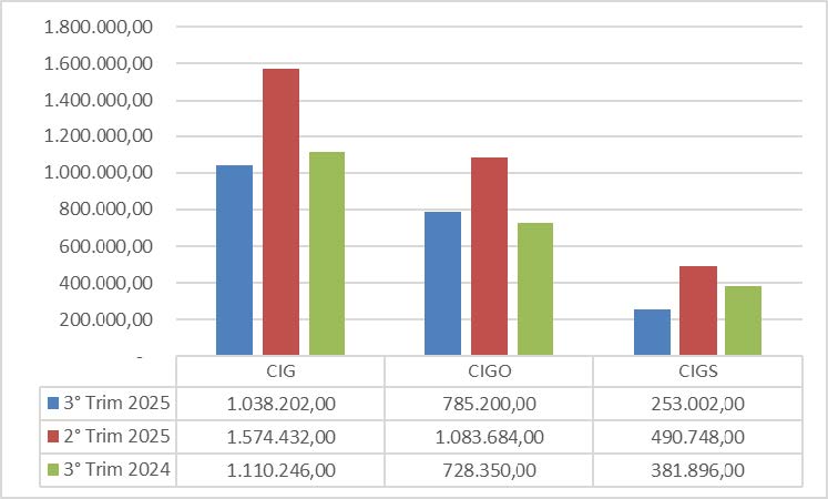 La CIGO segue lo stesso andamento: nel 3° trimestre 2025 si attesta a 789.742 ore, in netto calo rispetto sia al trimestre precedente (1.089.756 ore) sia rispetto al 3° trimestre 2024 (1.107.844 ore). La diminuzione riguarda quindi sia il breve periodo sia il confronto annuale, indicando un ricorso meno intenso allo strumento ordinario.